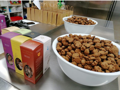 Pour l'instant ils apprenent, l'ensachage de nos biscuits et le collage des étiquettes sur les sachets Trio.